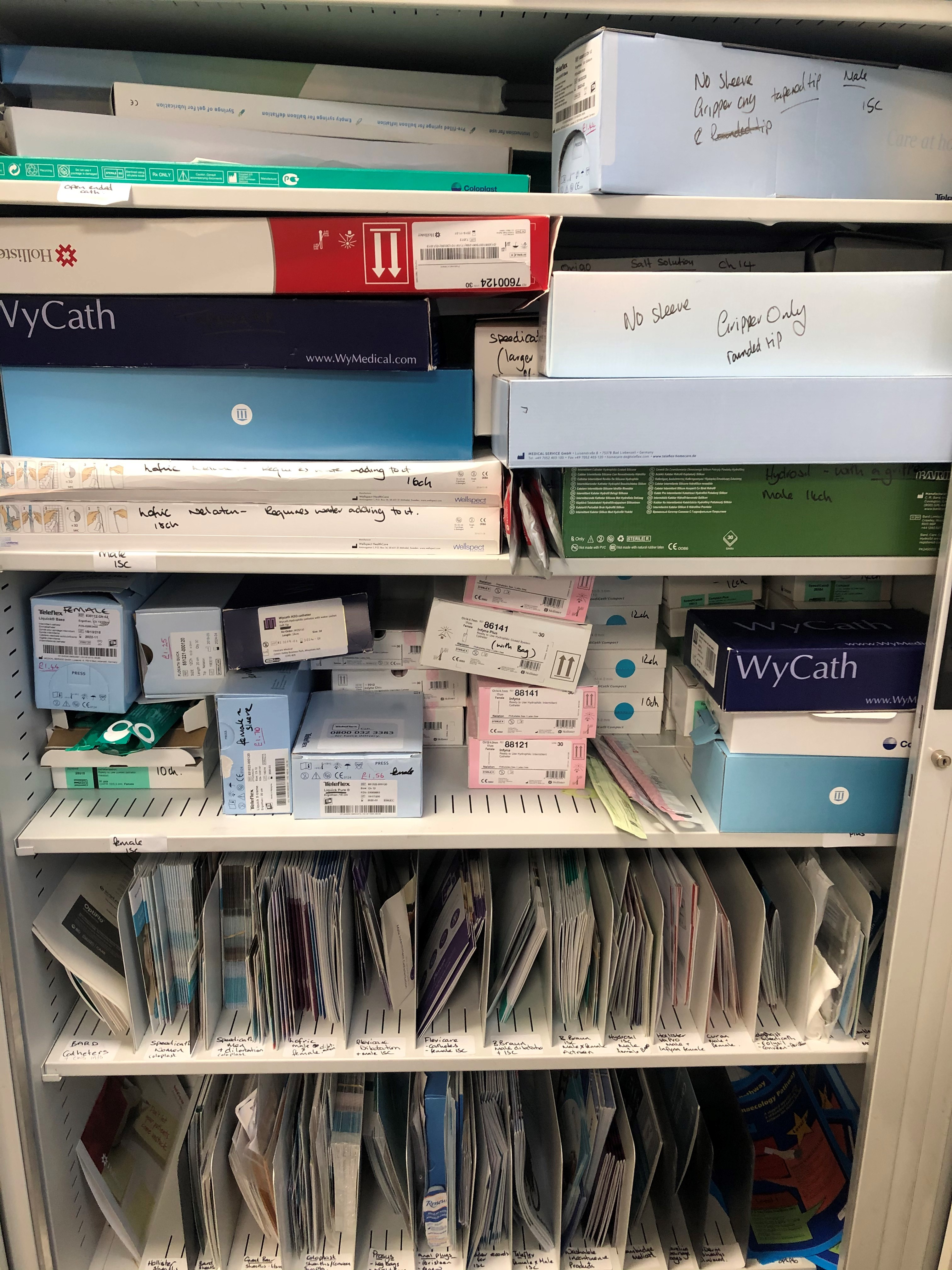 There has been a change around of staff for the Continence Service and in order to make the Prescription Service more effective for the new prescribers and to educate the new staff a ‘Cupboard of Knowledge’ has been developed. This has ease of access to examples of catheter stock prescribed, leaflets about products, files with pathways and guidelines. This information has been labelled and divided into section. It is everyone’s responsibility to update and stock and keep tidy.