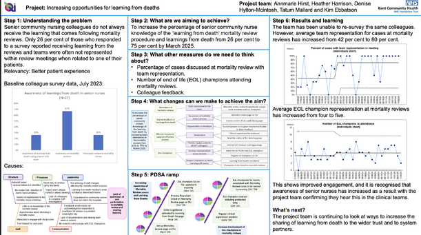 Senior community nursing colleagues at Kent Community Health NHS Foundation Trust said they did not always receive the learning that comes following mortality reviews. But after changes were made, team representation at the reviews has almost doubled, end of life champions are attending more and learning across the team has been strengthened.