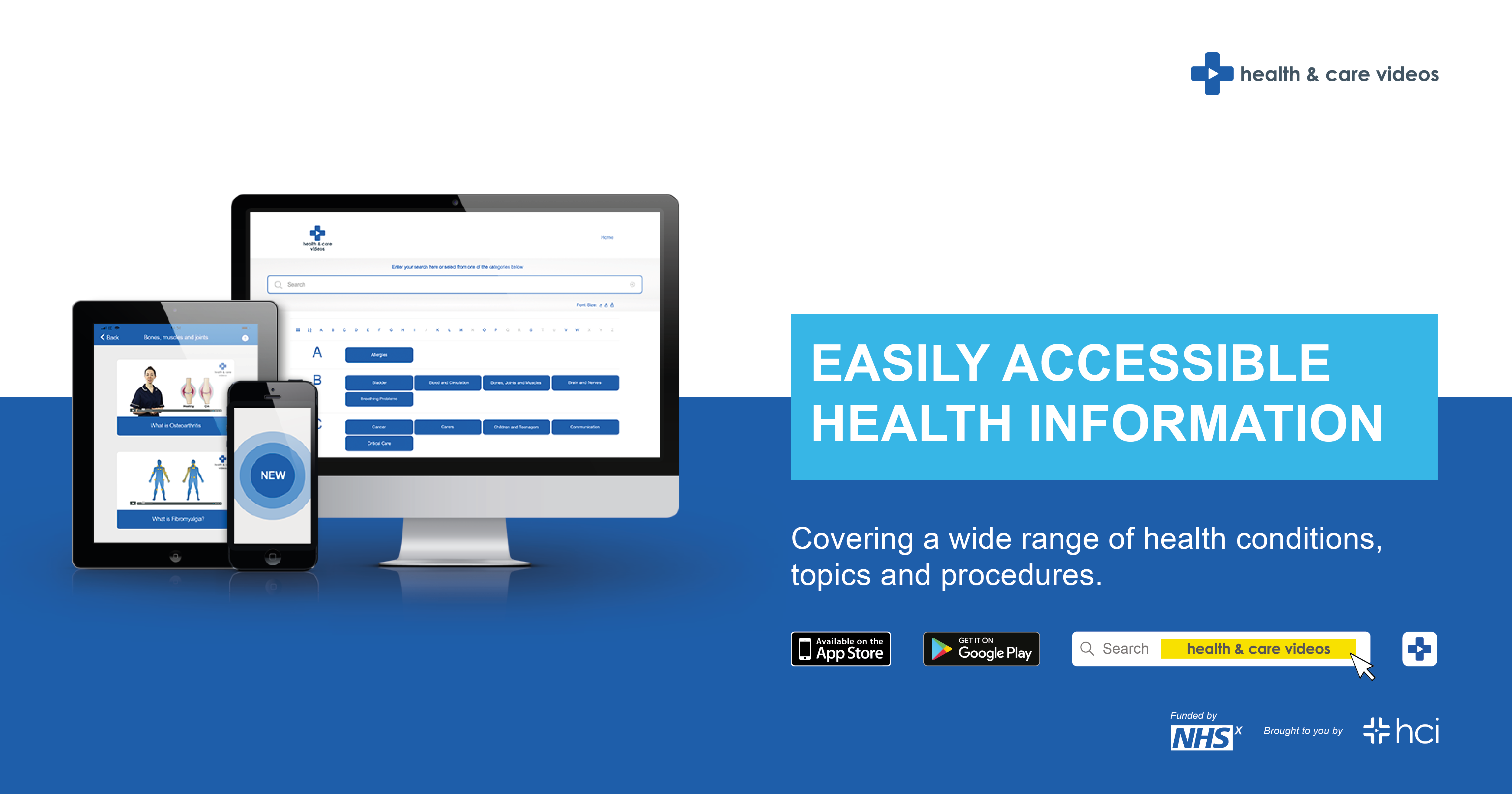 The Health and Care Video Library can be accessed at www.healthandcarevideos.uk and is also available as an app by searching for ‘Health and Care Videos’ in your app store.