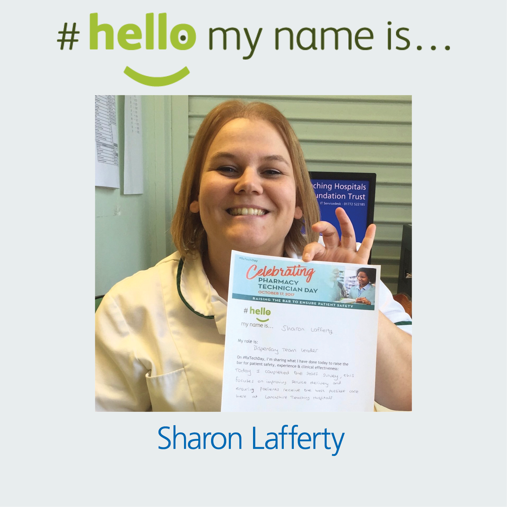 Staff have continued to promote and implement this campaign since its launch, six years ago to this date. Wards around the hospitals have now introduced #hellomynameis boards by patient’s beds in order to ensure that they know who is there to look after them, and make a conscious effort to introduce themselves to ensure familiarity and improved care. Photo boards have also been introduced at the entrances to wards with key members of staff on and their job title so that patients can be more aware of who they need to speak to for various issues or queries. This also aims to make staff more approachable and personable.
