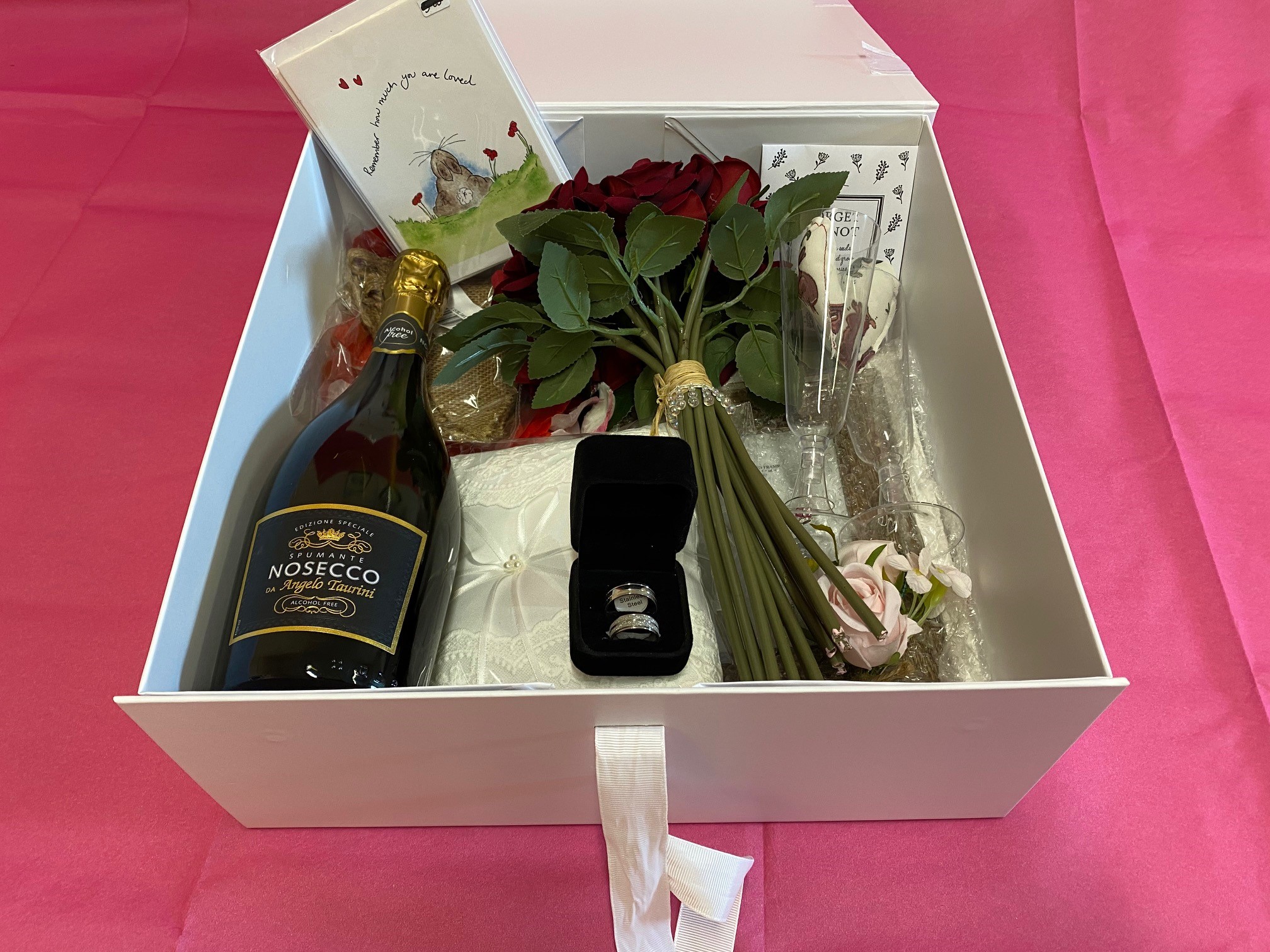 The box includes decorations to help create a celebratory atmosphere, including a bouquet & buttonhole, bunting, confetti, wedding rings with a ring cushion and as small mementoes for loved ones to keep and remember the special day.